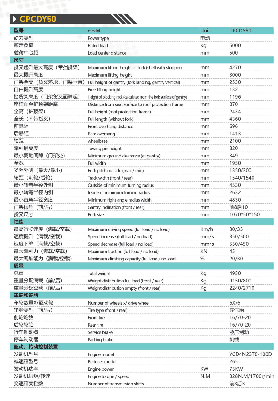 • 產(chǎn)品名稱: CPCDY5.0噸交接式越野叉車(chē)